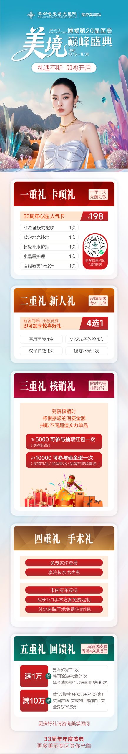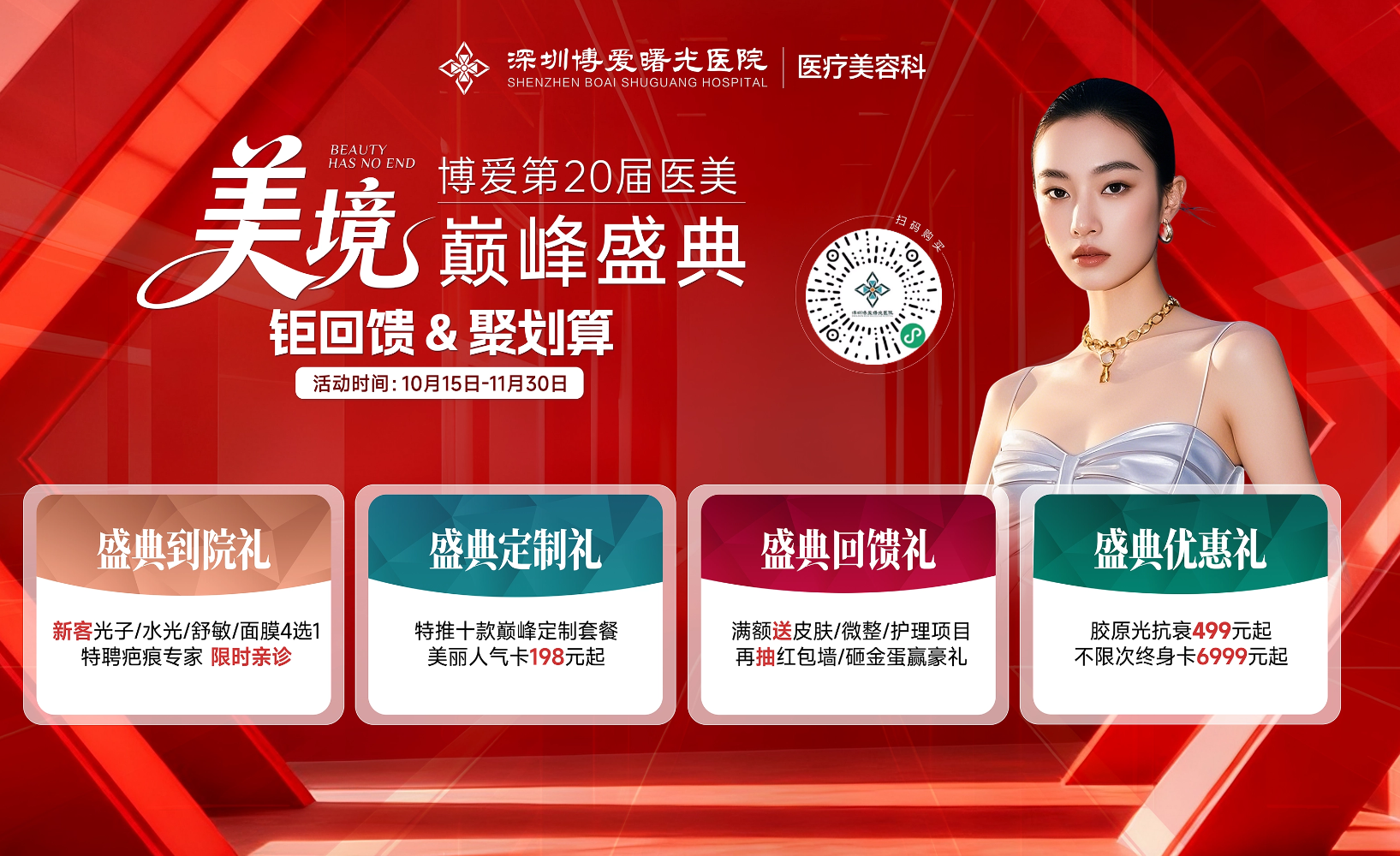 我們常說,美好的事物,值得被認真對待。 而一份真正的禮遇,應當從你決定變美的那一刻,就已開始。 10月15日至11月30日,深圳博愛曙光醫院「第20屆醫美巔峰盛典——美境」溫暖啟幕。我們擯棄了複雜的規則,只將一份份實實在在的禮遇,靜置於此。 只為等你到來,親手開啟。美自心生,境由你造。 在這場名為“美境”的盛典中,我們更願將它視為一場為你精心策劃的禮遇。 無需猶豫,也不必觀望。所有的美好與饋贈,都從你踏入這裡的那一刻,一一為你呈現。